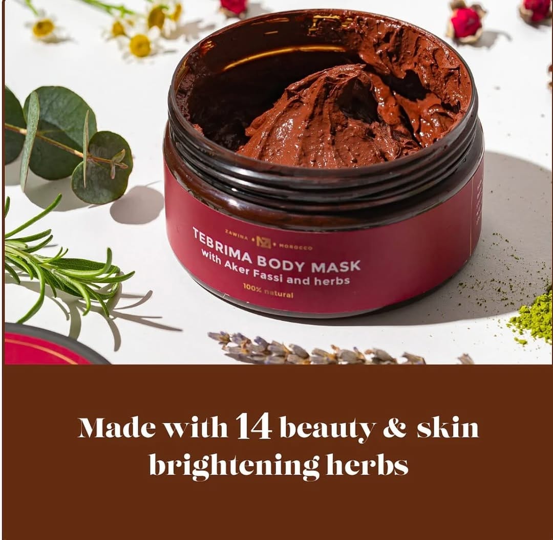 🌿 It’s a 100% natural herbal body mask made with Moroccan Tebrima powder, mineral clays, and botanicals to detoxify, brighten, and cleanse the skin.